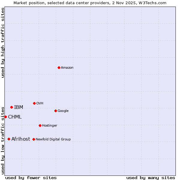 TechnologiesContent ManagementServer-side Languages Client-side Languages JavaScript Libraries CSS Frameworks Web Servers Web Panels Operating Systems Web Hosting Data Centers Reverse Proxies DNS Servers Email Servers SSL Certificate Authorities Content Delivery Traffic Analysis Tools Advertising Networks Tag Managers Social Widgets Site Elements Structured Data Markup Languages Character Encodings Image File Formats Top Level Domains Server Locations Content Languages | Technologies > Data Centers > Technology usage comparison Comparison of the usage statistics of IBM vs. Afrihost vs. CHML for websitesThis report shows the usage statistics of IBM vs. Afrihost vs. CHML as data center provider on the web. See technologies overview for explanations on the methodologies used in the surveys. Our reports are updated daily. UsageThis diagram shows the percentages of websites using the selected technologies. How to read the diagram: