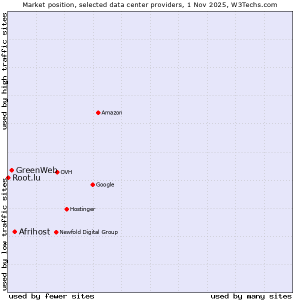 TechnologiesContent ManagementServer-side Languages Client-side Languages JavaScript Libraries CSS Frameworks Web Servers Web Panels Operating Systems Web Hosting Data Centers Reverse Proxies DNS Servers Email Servers SSL Certificate Authorities Content Delivery Traffic Analysis Tools Advertising Networks Tag Managers Social Widgets Site Elements Structured Data Markup Languages Character Encodings Image File Formats Top Level Domains Server Locations Content Languages | Technologies > Data Centers > Technology usage comparison Comparison of the usage statistics of Afrihost vs. GreenWeb vs. Root.lu for websitesThis report shows the usage statistics of Afrihost vs. GreenWeb vs. Root.lu as data center provider on the web. See technologies overview for explanations on the methodologies used in the surveys. Our reports are updated daily. UsageThis diagram shows the percentages of websites using the selected technologies. How to read the diagram: