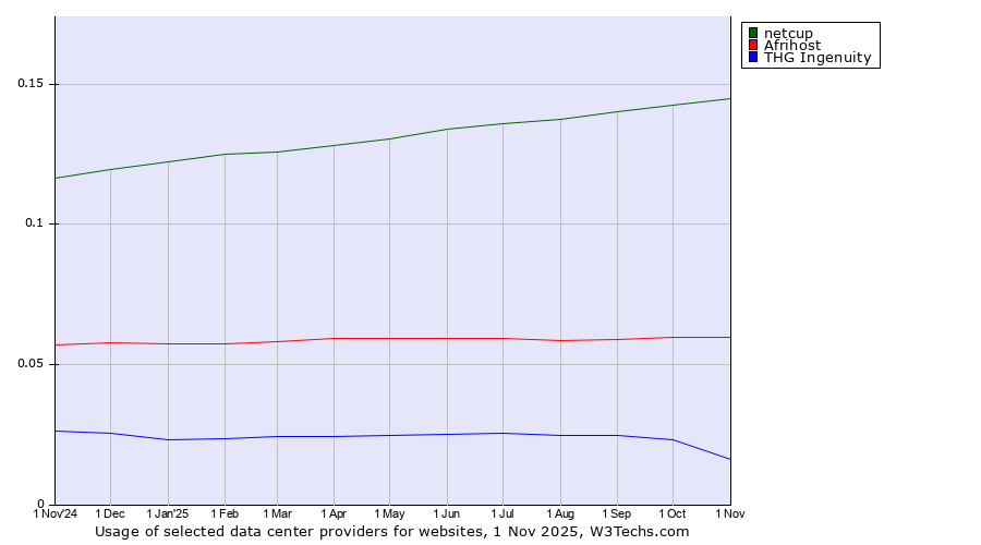 TechnologiesContent ManagementServer-side Languages Client-side Languages JavaScript Libraries CSS Frameworks Web Servers Web Panels Operating Systems Web Hosting Data Centers Reverse Proxies DNS Servers Email Servers SSL Certificate Authorities Content Delivery Traffic Analysis Tools Advertising Networks Tag Managers Social Widgets Site Elements Structured Data Markup Languages Character Encodings Image File Formats Top Level Domains Server Locations Content Languages | Technologies > Data Centers > Technology usage comparison Comparison of the usage statistics of netcup vs. Afrihost vs. THG Ingenuity for websitesThis report shows the usage statistics of netcup vs. Afrihost vs. THG Ingenuity as data center provider on the web. See technologies overview for explanations on the methodologies used in the surveys. Our reports are updated daily. UsageThis diagram shows the percentages of websites using the selected technologies. How to read the diagram:
