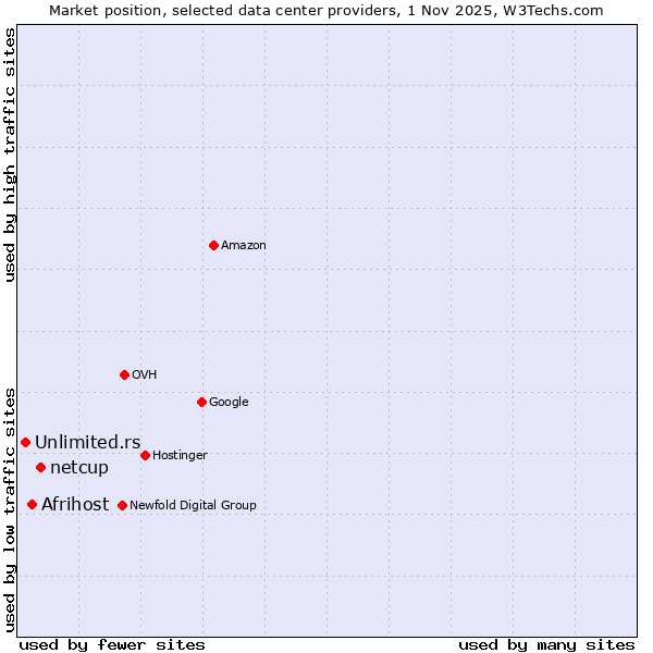 TechnologiesContent ManagementServer-side Languages Client-side Languages JavaScript Libraries CSS Frameworks Web Servers Web Panels Operating Systems Web Hosting Data Centers Reverse Proxies DNS Servers Email Servers SSL Certificate Authorities Content Delivery Traffic Analysis Tools Advertising Networks Tag Managers Social Widgets Site Elements Structured Data Markup Languages Character Encodings Image File Formats Top Level Domains Server Locations Content Languages | Technologies > Data Centers > Technology usage comparison Comparison of the usage statistics of netcup vs. Afrihost vs. Unlimited.rs for websitesThis report shows the usage statistics of netcup vs. Afrihost vs. Unlimited.rs as data center provider on the web. See technologies overview for explanations on the methodologies used in the surveys. Our reports are updated daily. UsageThis diagram shows the percentages of websites using the selected technologies. How to read the diagram: