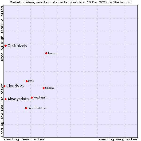 TechnologiesContent ManagementServer-side Languages Client-side Languages JavaScript Libraries CSS Frameworks Web Servers Web Panels Operating Systems Web Hosting Data Centers Reverse Proxies DNS Servers Email Servers SSL Certificate Authorities Content Delivery Traffic Analysis Tools Advertising Networks Tag Managers Social Widgets Site Elements Structured Data Markup Languages Character Encodings Image File Formats Top Level Domains Server Locations Content Languages | Technologies > Data Centers > Technology usage comparison Comparison of the usage statistics of Alwaysdata vs. Optimizely vs. CloudVPS for websitesThis report shows the usage statistics of Alwaysdata vs. Optimizely vs. CloudVPS as data center provider on the web. See technologies overview for explanations on the methodologies used in the surveys. Our reports are updated daily. UsageThis diagram shows the percentages of websites using the selected technologies. How to read the diagram:
