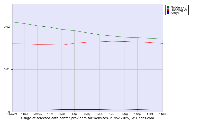 TechnologiesContent ManagementServer-side Languages Client-side Languages JavaScript Libraries CSS Frameworks Web Servers Web Panels Operating Systems Web Hosting Data Centers Reverse Proxies DNS Servers Email Servers SSL Certificate Authorities Content Delivery Traffic Analysis Tools Advertising Networks Tag Managers Social Widgets Site Elements Structured Data Markup Languages Character Encodings Image File Formats Top Level Domains Server Locations Content Languages | Technologies > Data Centers > Technology usage comparison Comparison of the usage statistics of Netdirekt vs. Hosting.cl vs. Arsys for websitesThis report shows the usage statistics of Netdirekt vs. Hosting.cl vs. Arsys as data center provider on the web. See technologies overview for explanations on the methodologies used in the surveys. Our reports are updated daily. UsageThis diagram shows the percentages of websites using the selected technologies. How to read the diagram: