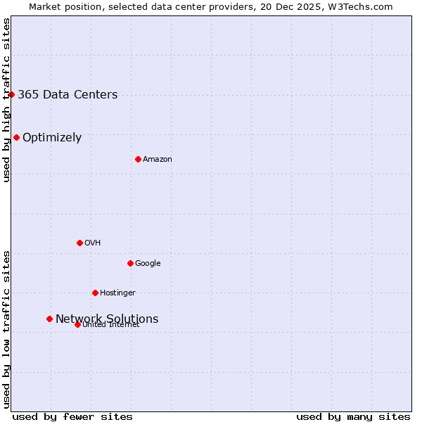 TechnologiesContent ManagementServer-side Languages Client-side Languages JavaScript Libraries CSS Frameworks Web Servers Web Panels Operating Systems Web Hosting Data Centers Reverse Proxies DNS Servers Email Servers SSL Certificate Authorities Content Delivery Traffic Analysis Tools Advertising Networks Tag Managers Social Widgets Site Elements Structured Data Markup Languages Character Encodings Image File Formats Top Level Domains Server Locations Content Languages | Technologies > Data Centers > Technology usage comparison Comparison of the usage statistics of Network Solutions vs. Optimizely vs. 365 Data Centers for websitesThis report shows the usage statistics of Network Solutions vs. Optimizely vs. 365 Data Centers as data center provider on the web. See technologies overview for explanations on the methodologies used in the surveys. Our reports are updated daily. UsageThis diagram shows the percentages of websites using the selected technologies. How to read the diagram: