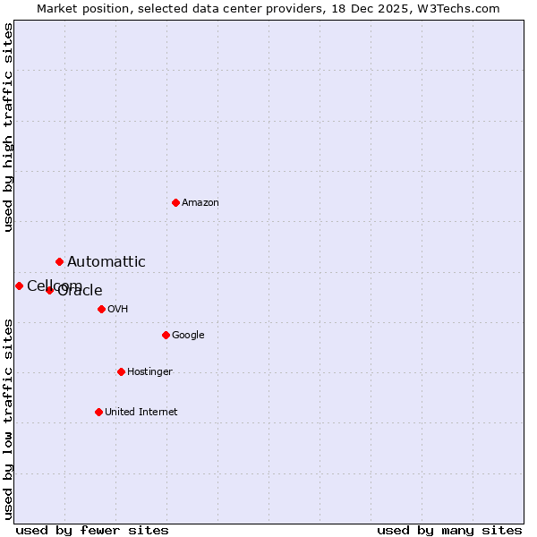 TechnologiesContent ManagementServer-side Languages Client-side Languages JavaScript Libraries CSS Frameworks Web Servers Web Panels Operating Systems Web Hosting Data Centers Reverse Proxies DNS Servers Email Servers SSL Certificate Authorities Content Delivery Traffic Analysis Tools Advertising Networks Tag Managers Social Widgets Site Elements Structured Data Markup Languages Character Encodings Image File Formats Top Level Domains Server Locations Content Languages | Technologies > Data Centers > Technology usage comparison Comparison of the usage statistics of Automattic vs. Oracle vs. Cellcom for websitesThis report shows the usage statistics of Automattic vs. Oracle vs. Cellcom as data center provider on the web. See technologies overview for explanations on the methodologies used in the surveys. Our reports are updated daily. UsageThis diagram shows the percentages of websites using the selected technologies. How to read the diagram: