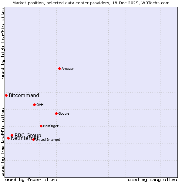 TechnologiesContent ManagementServer-side Languages Client-side Languages JavaScript Libraries CSS Frameworks Web Servers Web Panels Operating Systems Web Hosting Data Centers Reverse Proxies DNS Servers Email Servers SSL Certificate Authorities Content Delivery Traffic Analysis Tools Advertising Networks Tag Managers Social Widgets Site Elements Structured Data Markup Languages Character Encodings Image File Formats Top Level Domains Server Locations Content Languages | Technologies > Data Centers > Technology usage comparison Comparison of the usage statistics of RBC Group vs. Netinternet vs. Bitcommand for websitesThis report shows the usage statistics of RBC Group vs. Netinternet vs. Bitcommand as data center provider on the web. See technologies overview for explanations on the methodologies used in the surveys. Our reports are updated daily. UsageThis diagram shows the percentages of websites using the selected technologies. How to read the diagram: