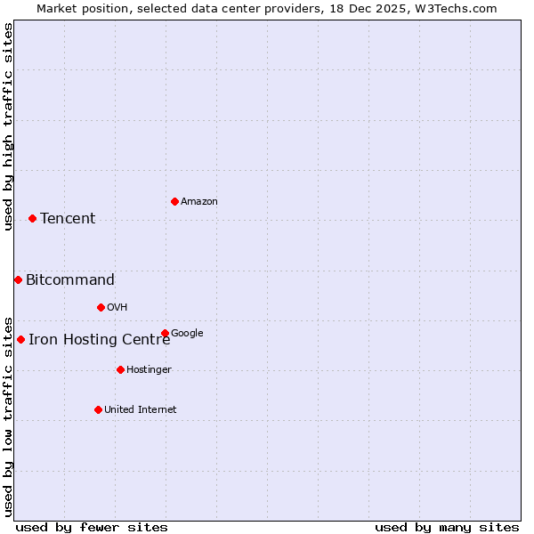 TechnologiesContent ManagementServer-side Languages Client-side Languages JavaScript Libraries CSS Frameworks Web Servers Web Panels Operating Systems Web Hosting Data Centers Reverse Proxies DNS Servers Email Servers SSL Certificate Authorities Content Delivery Traffic Analysis Tools Advertising Networks Tag Managers Social Widgets Site Elements Structured Data Markup Languages Character Encodings Image File Formats Top Level Domains Server Locations Content Languages | Technologies > Data Centers > Technology usage comparison Comparison of the usage statistics of Tencent vs. Iron Hosting Centre vs. Bitcommand for websitesThis report shows the usage statistics of Tencent vs. Iron Hosting Centre vs. Bitcommand as data center provider on the web. See technologies overview for explanations on the methodologies used in the surveys. Our reports are updated daily. UsageThis diagram shows the percentages of websites using the selected technologies. How to read the diagram:
