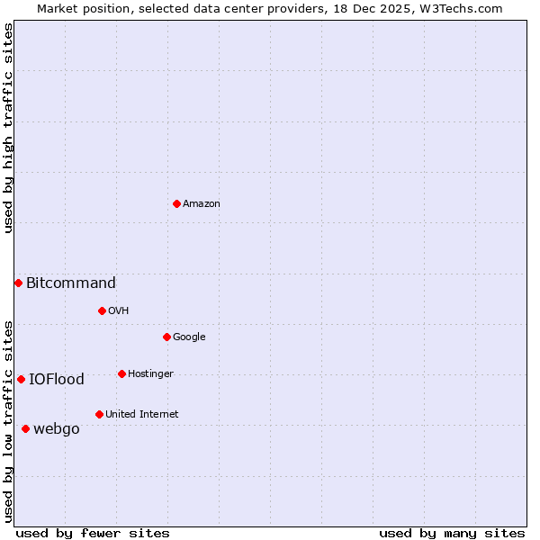 TechnologiesContent ManagementServer-side Languages Client-side Languages JavaScript Libraries CSS Frameworks Web Servers Web Panels Operating Systems Web Hosting Data Centers Reverse Proxies DNS Servers Email Servers SSL Certificate Authorities Content Delivery Traffic Analysis Tools Advertising Networks Tag Managers Social Widgets Site Elements Structured Data Markup Languages Character Encodings Image File Formats Top Level Domains Server Locations Content Languages | Technologies > Data Centers > Technology usage comparison Comparison of the usage statistics of webgo vs. IOFlood vs. Bitcommand for websitesThis report shows the usage statistics of webgo vs. IOFlood vs. Bitcommand as data center provider on the web. See technologies overview for explanations on the methodologies used in the surveys. Our reports are updated daily. UsageThis diagram shows the percentages of websites using the selected technologies. How to read the diagram: