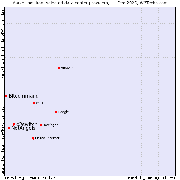 TechnologiesContent ManagementServer-side Languages Client-side Languages JavaScript Libraries CSS Frameworks Web Servers Web Panels Operating Systems Web Hosting Data Centers Reverse Proxies DNS Servers Email Servers SSL Certificate Authorities Content Delivery Traffic Analysis Tools Advertising Networks Tag Managers Social Widgets Site Elements Structured Data Markup Languages Character Encodings Image File Formats Top Level Domains Server Locations Content Languages | Technologies > Data Centers > Technology usage comparison Comparison of the usage statistics of o2switch vs. NetAngels vs. Bitcommand for websitesThis report shows the usage statistics of o2switch vs. NetAngels vs. Bitcommand as data center provider on the web. See technologies overview for explanations on the methodologies used in the surveys. Our reports are updated daily. UsageThis diagram shows the percentages of websites using the selected technologies. How to read the diagram: