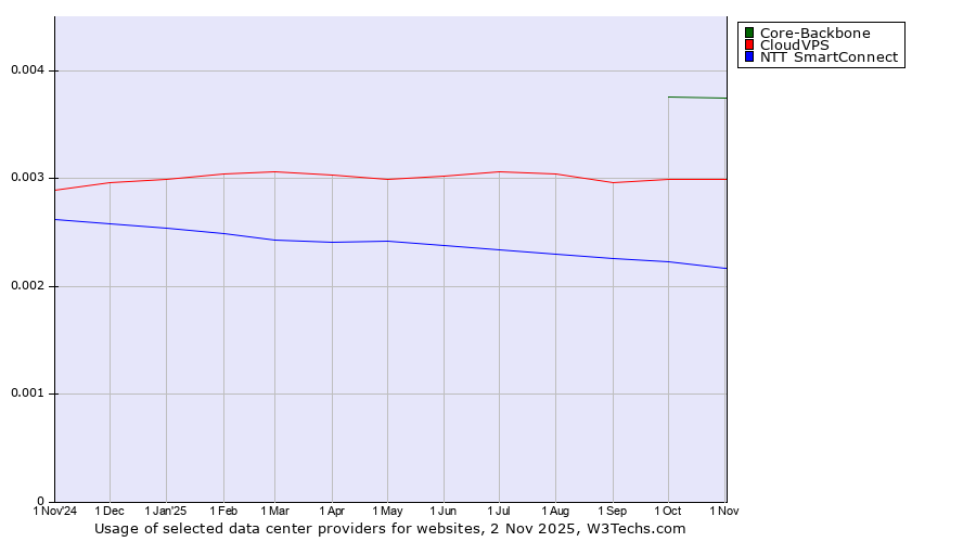 TechnologiesContent ManagementServer-side Languages Client-side Languages JavaScript Libraries CSS Frameworks Web Servers Web Panels Operating Systems Web Hosting Data Centers Reverse Proxies DNS Servers Email Servers SSL Certificate Authorities Content Delivery Traffic Analysis Tools Advertising Networks Tag Managers Social Widgets Site Elements Structured Data Markup Languages Character Encodings Image File Formats Top Level Domains Server Locations Content Languages | Technologies > Data Centers > Technology usage comparison Comparison of the usage statistics of Core-Backbone vs. CloudVPS vs. NTT SmartConnect for websitesThis report shows the usage statistics of Core-Backbone vs. CloudVPS vs. NTT SmartConnect as data center provider on the web. See technologies overview for explanations on the methodologies used in the surveys. Our reports are updated daily. UsageThis diagram shows the percentages of websites using the selected technologies. How to read the diagram: