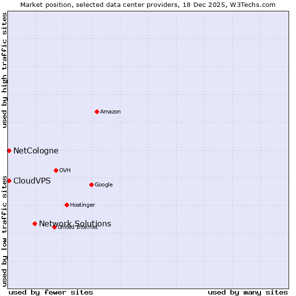 TechnologiesContent ManagementServer-side Languages Client-side Languages JavaScript Libraries CSS Frameworks Web Servers Web Panels Operating Systems Web Hosting Data Centers Reverse Proxies DNS Servers Email Servers SSL Certificate Authorities Content Delivery Traffic Analysis Tools Advertising Networks Tag Managers Social Widgets Site Elements Structured Data Markup Languages Character Encodings Image File Formats Top Level Domains Server Locations Content Languages | Technologies > Data Centers > Technology usage comparison Comparison of the usage statistics of Network Solutions vs. NetCologne vs. CloudVPS for websitesThis report shows the usage statistics of Network Solutions vs. NetCologne vs. CloudVPS as data center provider on the web. See technologies overview for explanations on the methodologies used in the surveys. Our reports are updated daily. UsageThis diagram shows the percentages of websites using the selected technologies. How to read the diagram: