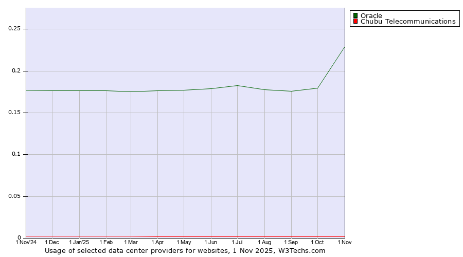 TechnologiesContent ManagementServer-side Languages Client-side Languages JavaScript Libraries CSS Frameworks Web Servers Web Panels Operating Systems Web Hosting Data Centers Reverse Proxies DNS Servers Email Servers SSL Certificate Authorities Content Delivery Traffic Analysis Tools Advertising Networks Tag Managers Social Widgets Site Elements Structured Data Markup Languages Character Encodings Image File Formats Top Level Domains Server Locations Content Languages ComparisonCompare with other | Technologies > Data Centers > Technology usage comparison Comparison of the usage statistics of Oracle vs. Chubu Telecommunications for websitesThis report shows the usage statistics of Oracle vs. Chubu Telecommunications as data center provider on the web. See technologies overview for explanations on the methodologies used in the surveys. Our reports are updated daily. UsageThis diagram shows the percentages of websites using the selected technologies. How to read the diagram: