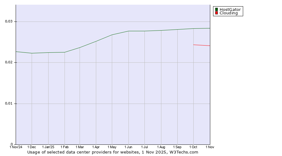 TechnologiesContent ManagementServer-side Languages Client-side Languages JavaScript Libraries CSS Frameworks Web Servers Web Panels Operating Systems Web Hosting Data Centers Reverse Proxies DNS Servers Email Servers SSL Certificate Authorities Content Delivery Traffic Analysis Tools Advertising Networks Tag Managers Social Widgets Site Elements Structured Data Markup Languages Character Encodings Image File Formats Top Level Domains Server Locations Content Languages ComparisonCompare with other | Technologies > Data Centers > Technology usage comparison Comparison of the usage statistics of HostGator vs. Clouding for websitesThis report shows the usage statistics of HostGator vs. Clouding as data center provider on the web. See technologies overview for explanations on the methodologies used in the surveys. Our reports are updated daily. UsageThis diagram shows the percentages of websites using the selected technologies. How to read the diagram: