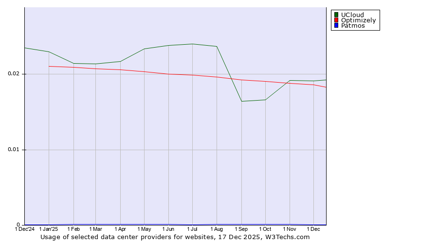 TechnologiesContent ManagementServer-side Languages Client-side Languages JavaScript Libraries CSS Frameworks Web Servers Web Panels Operating Systems Web Hosting Data Centers Reverse Proxies DNS Servers Email Servers SSL Certificate Authorities Content Delivery Traffic Analysis Tools Advertising Networks Tag Managers Social Widgets Site Elements Structured Data Markup Languages Character Encodings Image File Formats Top Level Domains Server Locations Content Languages | Technologies > Data Centers > Technology usage comparison Comparison of the usage statistics of UCloud vs. Optimizely vs. Patmos for websitesThis report shows the usage statistics of UCloud vs. Optimizely vs. Patmos as data center provider on the web. See technologies overview for explanations on the methodologies used in the surveys. Our reports are updated daily. UsageThis diagram shows the percentages of websites using the selected technologies. How to read the diagram: