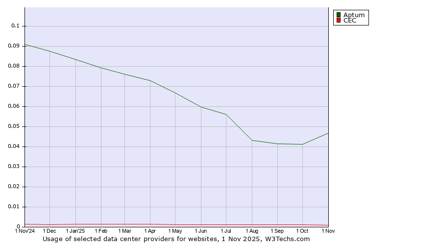 TechnologiesContent ManagementServer-side Languages Client-side Languages JavaScript Libraries CSS Frameworks Web Servers Web Panels Operating Systems Web Hosting Data Centers Reverse Proxies DNS Servers Email Servers SSL Certificate Authorities Content Delivery Traffic Analysis Tools Advertising Networks Tag Managers Social Widgets Site Elements Structured Data Markup Languages Character Encodings Image File Formats Top Level Domains Server Locations Content Languages ComparisonCompare with other | Technologies > Data Centers > Technology usage comparison Comparison of the usage statistics of Aptum vs. CEC for websitesThis report shows the usage statistics of Aptum vs. CEC as data center provider on the web. See technologies overview for explanations on the methodologies used in the surveys. Our reports are updated daily. UsageThis diagram shows the percentages of websites using the selected technologies. How to read the diagram: