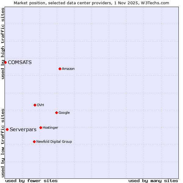 TechnologiesContent ManagementServer-side Languages Client-side Languages JavaScript Libraries CSS Frameworks Web Servers Web Panels Operating Systems Web Hosting Data Centers Reverse Proxies DNS Servers Email Servers SSL Certificate Authorities Content Delivery Traffic Analysis Tools Advertising Networks Tag Managers Social Widgets Site Elements Structured Data Markup Languages Character Encodings Image File Formats Top Level Domains Server Locations Content Languages ComparisonCompare with other | Technologies > Data Centers > Technology usage comparison Comparison of the usage statistics of Serverpars vs. COMSATS for websitesThis report shows the usage statistics of Serverpars vs. COMSATS as data center provider on the web. See technologies overview for explanations on the methodologies used in the surveys. Our reports are updated daily. UsageThis diagram shows the percentages of websites using the selected technologies. How to read the diagram: