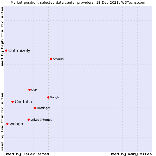 TechnologiesContent ManagementServer-side Languages Client-side Languages JavaScript Libraries CSS Frameworks Web Servers Web Panels Operating Systems Web Hosting Data Centers Reverse Proxies DNS Servers Email Servers SSL Certificate Authorities Content Delivery Traffic Analysis Tools Advertising Networks Tag Managers Social Widgets Site Elements Structured Data Markup Languages Character Encodings Image File Formats Top Level Domains Server Locations Content Languages | Technologies > Data Centers > Technology usage comparison Comparison of the usage statistics of Contabo vs. webgo vs. Optimizely for websitesThis report shows the usage statistics of Contabo vs. webgo vs. Optimizely as data center provider on the web. See technologies overview for explanations on the methodologies used in the surveys. Our reports are updated daily. UsageThis diagram shows the percentages of websites using the selected technologies. How to read the diagram: