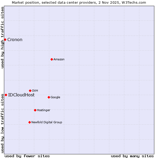 TechnologiesContent ManagementServer-side Languages Client-side Languages JavaScript Libraries CSS Frameworks Web Servers Web Panels Operating Systems Web Hosting Data Centers Reverse Proxies DNS Servers Email Servers SSL Certificate Authorities Content Delivery Traffic Analysis Tools Advertising Networks Tag Managers Social Widgets Site Elements Structured Data Markup Languages Character Encodings Image File Formats Top Level Domains Server Locations Content Languages ComparisonCompare with other | Technologies > Data Centers > Technology usage comparison Comparison of the usage statistics of IDCloudHost vs. Cronon for websitesThis report shows the usage statistics of IDCloudHost vs. Cronon as data center provider on the web. See technologies overview for explanations on the methodologies used in the surveys. Our reports are updated daily. UsageThis diagram shows the percentages of websites using the selected technologies. How to read the diagram: