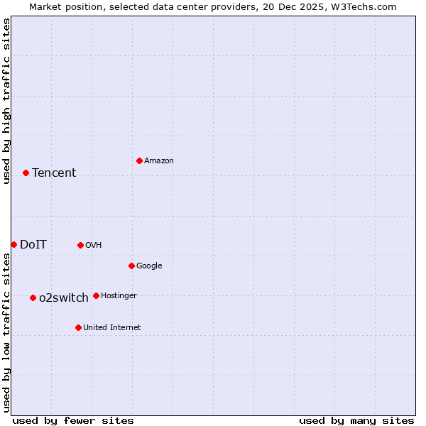 TechnologiesContent ManagementServer-side Languages Client-side Languages JavaScript Libraries CSS Frameworks Web Servers Web Panels Operating Systems Web Hosting Data Centers Reverse Proxies DNS Servers Email Servers SSL Certificate Authorities Content Delivery Traffic Analysis Tools Advertising Networks Tag Managers Social Widgets Site Elements Structured Data Markup Languages Character Encodings Image File Formats Top Level Domains Server Locations Content Languages | Technologies > Data Centers > Technology usage comparison Comparison of the usage statistics of o2switch vs. Tencent vs. DoIT for websitesThis report shows the usage statistics of o2switch vs. Tencent vs. DoIT as data center provider on the web. See technologies overview for explanations on the methodologies used in the surveys. Our reports are updated daily. UsageThis diagram shows the percentages of websites using the selected technologies. How to read the diagram: