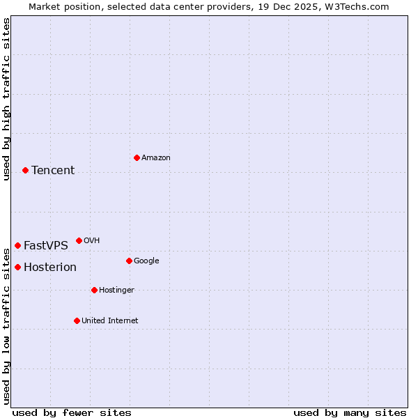 TechnologiesContent ManagementServer-side Languages Client-side Languages JavaScript Libraries CSS Frameworks Web Servers Web Panels Operating Systems Web Hosting Data Centers Reverse Proxies DNS Servers Email Servers SSL Certificate Authorities Content Delivery Traffic Analysis Tools Advertising Networks Tag Managers Social Widgets Site Elements Structured Data Markup Languages Character Encodings Image File Formats Top Level Domains Server Locations Content Languages | Technologies > Data Centers > Technology usage comparison Comparison of the usage statistics of Tencent vs. FastVPS vs. Hosterion for websitesThis report shows the usage statistics of Tencent vs. FastVPS vs. Hosterion as data center provider on the web. See technologies overview for explanations on the methodologies used in the surveys. Our reports are updated daily. UsageThis diagram shows the percentages of websites using the selected technologies. How to read the diagram: