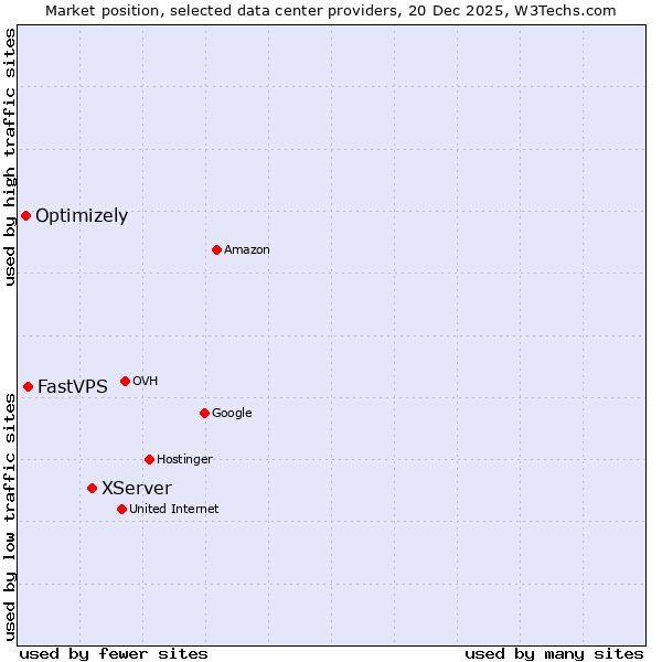 TechnologiesContent ManagementServer-side Languages Client-side Languages JavaScript Libraries CSS Frameworks Web Servers Web Panels Operating Systems Web Hosting Data Centers Reverse Proxies DNS Servers Email Servers SSL Certificate Authorities Content Delivery Traffic Analysis Tools Advertising Networks Tag Managers Social Widgets Site Elements Structured Data Markup Languages Character Encodings Image File Formats Top Level Domains Server Locations Content Languages | Technologies > Data Centers > Technology usage comparison Comparison of the usage statistics of XServer vs. FastVPS vs. Optimizely for websitesThis report shows the usage statistics of XServer vs. FastVPS vs. Optimizely as data center provider on the web. See technologies overview for explanations on the methodologies used in the surveys. Our reports are updated daily. UsageThis diagram shows the percentages of websites using the selected technologies. How to read the diagram: