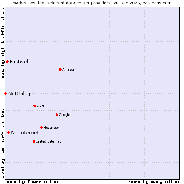 TechnologiesContent ManagementServer-side Languages Client-side Languages JavaScript Libraries CSS Frameworks Web Servers Web Panels Operating Systems Web Hosting Data Centers Reverse Proxies DNS Servers Email Servers SSL Certificate Authorities Content Delivery Traffic Analysis Tools Advertising Networks Tag Managers Social Widgets Site Elements Structured Data Markup Languages Character Encodings Image File Formats Top Level Domains Server Locations Content Languages | Technologies > Data Centers > Technology usage comparison Comparison of the usage statistics of Netinternet vs. Fastweb vs. NetCologne for websitesThis report shows the usage statistics of Netinternet vs. Fastweb vs. NetCologne as data center provider on the web. See technologies overview for explanations on the methodologies used in the surveys. Our reports are updated daily. UsageThis diagram shows the percentages of websites using the selected technologies. How to read the diagram: