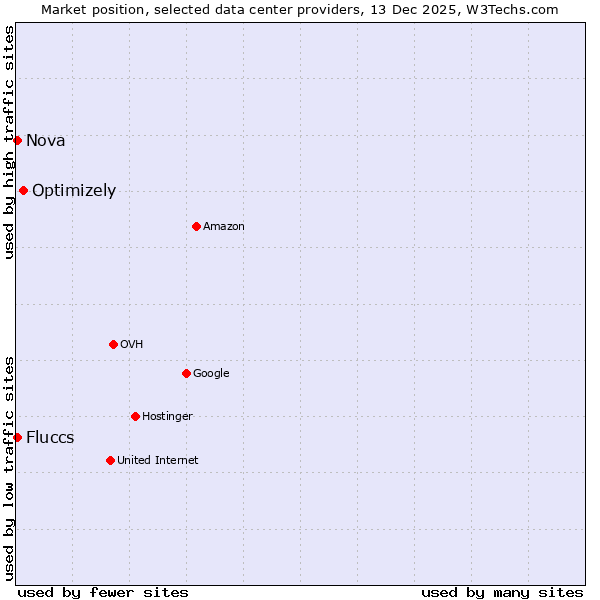 TechnologiesContent ManagementServer-side Languages Client-side Languages JavaScript Libraries CSS Frameworks Web Servers Web Panels Operating Systems Web Hosting Data Centers Reverse Proxies DNS Servers Email Servers SSL Certificate Authorities Content Delivery Traffic Analysis Tools Advertising Networks Tag Managers Social Widgets Site Elements Structured Data Markup Languages Character Encodings Image File Formats Top Level Domains Server Locations Content Languages | Technologies > Data Centers > Technology usage comparison Comparison of the usage statistics of Optimizely vs. Fluccs vs. Nova for websitesThis report shows the usage statistics of Optimizely vs. Fluccs vs. Nova as data center provider on the web. See technologies overview for explanations on the methodologies used in the surveys. Our reports are updated daily. UsageThis diagram shows the percentages of websites using the selected technologies. How to read the diagram: