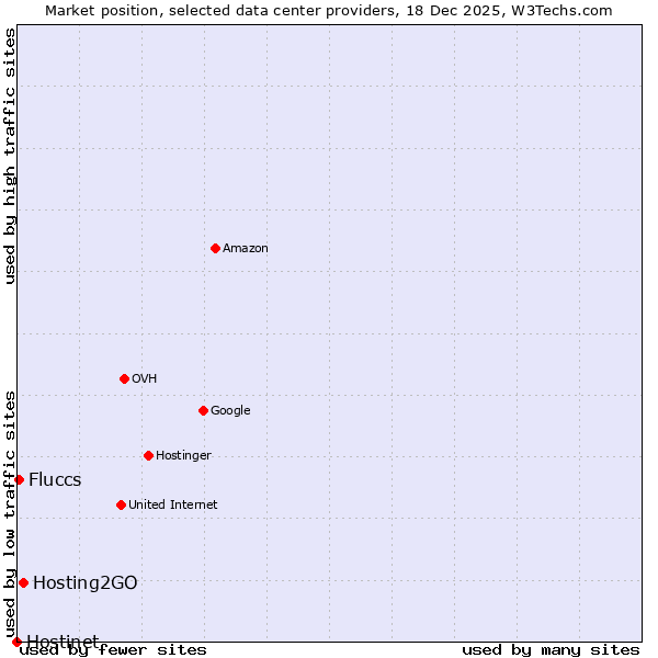 TechnologiesContent ManagementServer-side Languages Client-side Languages JavaScript Libraries CSS Frameworks Web Servers Web Panels Operating Systems Web Hosting Data Centers Reverse Proxies DNS Servers Email Servers SSL Certificate Authorities Content Delivery Traffic Analysis Tools Advertising Networks Tag Managers Social Widgets Site Elements Structured Data Markup Languages Character Encodings Image File Formats Top Level Domains Server Locations Content Languages | Technologies > Data Centers > Technology usage comparison Comparison of the usage statistics of Hosting2GO vs. Fluccs vs. Hostinet for websitesThis report shows the usage statistics of Hosting2GO vs. Fluccs vs. Hostinet as data center provider on the web. See technologies overview for explanations on the methodologies used in the surveys. Our reports are updated daily. UsageThis diagram shows the percentages of websites using the selected technologies. How to read the diagram: