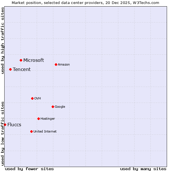 TechnologiesContent ManagementServer-side Languages Client-side Languages JavaScript Libraries CSS Frameworks Web Servers Web Panels Operating Systems Web Hosting Data Centers Reverse Proxies DNS Servers Email Servers SSL Certificate Authorities Content Delivery Traffic Analysis Tools Advertising Networks Tag Managers Social Widgets Site Elements Structured Data Markup Languages Character Encodings Image File Formats Top Level Domains Server Locations Content Languages | Technologies > Data Centers > Technology usage comparison Comparison of the usage statistics of Microsoft vs. Tencent vs. Fluccs for websitesThis report shows the usage statistics of Microsoft vs. Tencent vs. Fluccs as data center provider on the web. See technologies overview for explanations on the methodologies used in the surveys. Our reports are updated daily. UsageThis diagram shows the percentages of websites using the selected technologies. How to read the diagram: