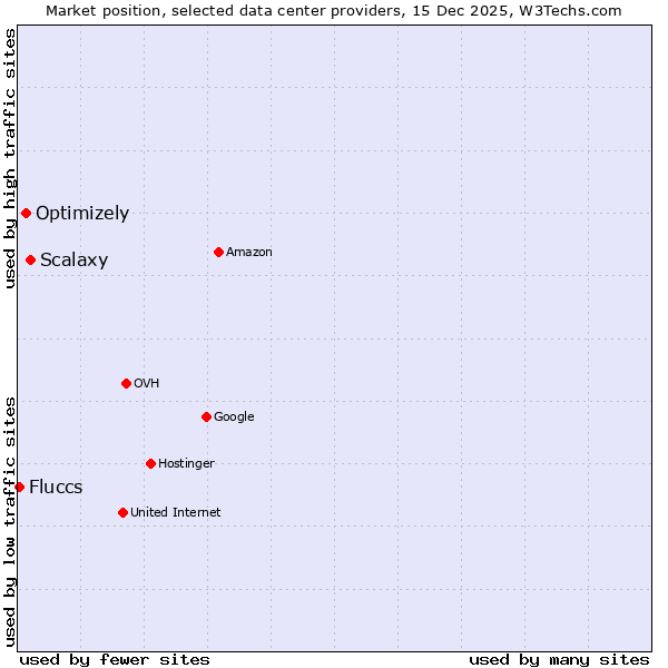 TechnologiesContent ManagementServer-side Languages Client-side Languages JavaScript Libraries CSS Frameworks Web Servers Web Panels Operating Systems Web Hosting Data Centers Reverse Proxies DNS Servers Email Servers SSL Certificate Authorities Content Delivery Traffic Analysis Tools Advertising Networks Tag Managers Social Widgets Site Elements Structured Data Markup Languages Character Encodings Image File Formats Top Level Domains Server Locations Content Languages | Technologies > Data Centers > Technology usage comparison Comparison of the usage statistics of Scalaxy vs. Optimizely vs. Fluccs for websitesThis report shows the usage statistics of Scalaxy vs. Optimizely vs. Fluccs as data center provider on the web. See technologies overview for explanations on the methodologies used in the surveys. Our reports are updated daily. UsageThis diagram shows the percentages of websites using the selected technologies. How to read the diagram: