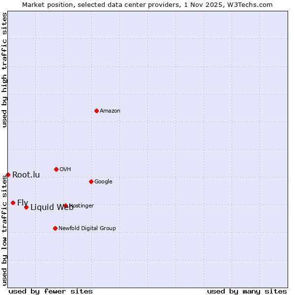 TechnologiesContent ManagementServer-side Languages Client-side Languages JavaScript Libraries CSS Frameworks Web Servers Web Panels Operating Systems Web Hosting Data Centers Reverse Proxies DNS Servers Email Servers SSL Certificate Authorities Content Delivery Traffic Analysis Tools Advertising Networks Tag Managers Social Widgets Site Elements Structured Data Markup Languages Character Encodings Image File Formats Top Level Domains Server Locations Content Languages | Technologies > Data Centers > Technology usage comparison Comparison of the usage statistics of Liquid Web vs. Fly vs. Root.lu for websitesThis report shows the usage statistics of Liquid Web vs. Fly vs. Root.lu as data center provider on the web. See technologies overview for explanations on the methodologies used in the surveys. Our reports are updated daily. UsageThis diagram shows the percentages of websites using the selected technologies. How to read the diagram:
