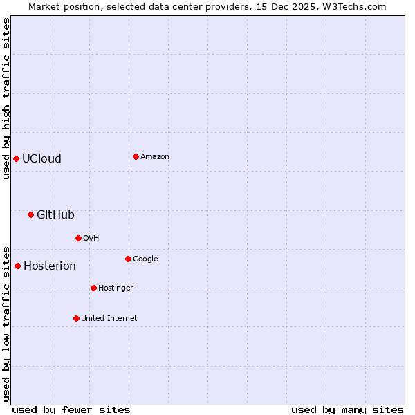 TechnologiesContent ManagementServer-side Languages Client-side Languages JavaScript Libraries CSS Frameworks Web Servers Web Panels Operating Systems Web Hosting Data Centers Reverse Proxies DNS Servers Email Servers SSL Certificate Authorities Content Delivery Traffic Analysis Tools Advertising Networks Tag Managers Social Widgets Site Elements Structured Data Markup Languages Character Encodings Image File Formats Top Level Domains Server Locations Content Languages | Technologies > Data Centers > Technology usage comparison Comparison of the usage statistics of GitHub vs. Hosterion vs. UCloud for websitesThis report shows the usage statistics of GitHub vs. Hosterion vs. UCloud as data center provider on the web. See technologies overview for explanations on the methodologies used in the surveys. Our reports are updated daily. UsageThis diagram shows the percentages of websites using the selected technologies. How to read the diagram: