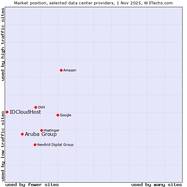 TechnologiesContent ManagementServer-side Languages Client-side Languages JavaScript Libraries CSS Frameworks Web Servers Web Panels Operating Systems Web Hosting Data Centers Reverse Proxies DNS Servers Email Servers SSL Certificate Authorities Content Delivery Traffic Analysis Tools Advertising Networks Tag Managers Social Widgets Site Elements Structured Data Markup Languages Character Encodings Image File Formats Top Level Domains Server Locations Content Languages ComparisonCompare with other | Technologies > Data Centers > Technology usage comparison Comparison of the usage statistics of Aruba Group vs. IDCloudHost for websitesThis report shows the usage statistics of Aruba Group vs. IDCloudHost as data center provider on the web. See technologies overview for explanations on the methodologies used in the surveys. Our reports are updated daily. UsageThis diagram shows the percentages of websites using the selected technologies. How to read the diagram: