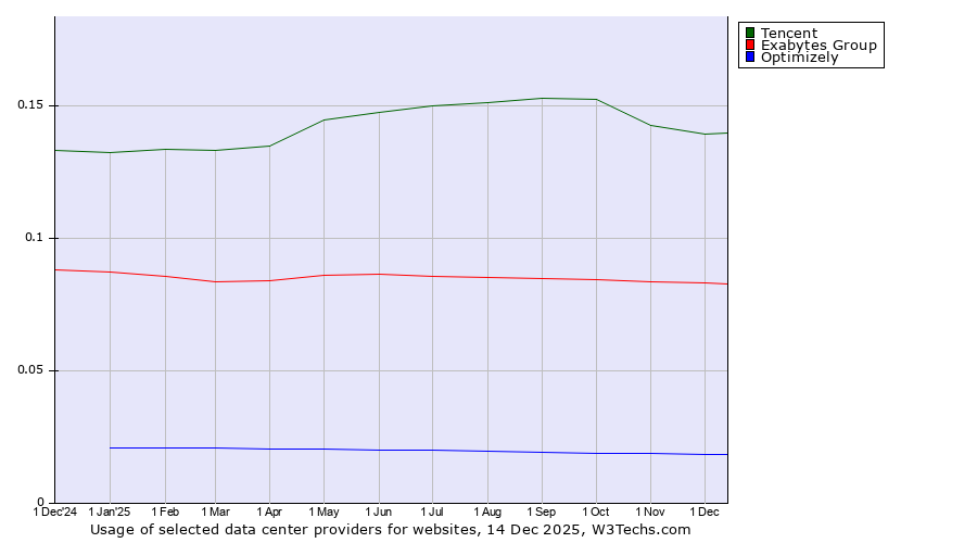 TechnologiesContent ManagementServer-side Languages Client-side Languages JavaScript Libraries CSS Frameworks Web Servers Web Panels Operating Systems Web Hosting Data Centers Reverse Proxies DNS Servers Email Servers SSL Certificate Authorities Content Delivery Traffic Analysis Tools Advertising Networks Tag Managers Social Widgets Site Elements Structured Data Markup Languages Character Encodings Image File Formats Top Level Domains Server Locations Content Languages | Technologies > Data Centers > Technology usage comparison Comparison of the usage statistics of Tencent vs. Exabytes Group vs. Optimizely for websitesThis report shows the usage statistics of Tencent vs. Exabytes Group vs. Optimizely as data center provider on the web. See technologies overview for explanations on the methodologies used in the surveys. Our reports are updated daily. UsageThis diagram shows the percentages of websites using the selected technologies. How to read the diagram: