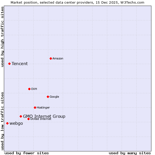 TechnologiesContent ManagementServer-side Languages Client-side Languages JavaScript Libraries CSS Frameworks Web Servers Web Panels Operating Systems Web Hosting Data Centers Reverse Proxies DNS Servers Email Servers SSL Certificate Authorities Content Delivery Traffic Analysis Tools Advertising Networks Tag Managers Social Widgets Site Elements Structured Data Markup Languages Character Encodings Image File Formats Top Level Domains Server Locations Content Languages | Technologies > Data Centers > Technology usage comparison Comparison of the usage statistics of GMO Internet Group vs. Tencent vs. webgo for websitesThis report shows the usage statistics of GMO Internet Group vs. Tencent vs. webgo as data center provider on the web. See technologies overview for explanations on the methodologies used in the surveys. Our reports are updated daily. UsageThis diagram shows the percentages of websites using the selected technologies. How to read the diagram: