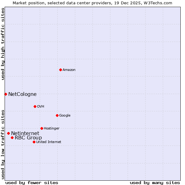 TechnologiesContent ManagementServer-side Languages Client-side Languages JavaScript Libraries CSS Frameworks Web Servers Web Panels Operating Systems Web Hosting Data Centers Reverse Proxies DNS Servers Email Servers SSL Certificate Authorities Content Delivery Traffic Analysis Tools Advertising Networks Tag Managers Social Widgets Site Elements Structured Data Markup Languages Character Encodings Image File Formats Top Level Domains Server Locations Content Languages | Technologies > Data Centers > Technology usage comparison Comparison of the usage statistics of RBC Group vs. Netinternet vs. NetCologne for websitesThis report shows the usage statistics of RBC Group vs. Netinternet vs. NetCologne as data center provider on the web. See technologies overview for explanations on the methodologies used in the surveys. Our reports are updated daily. UsageThis diagram shows the percentages of websites using the selected technologies. How to read the diagram: