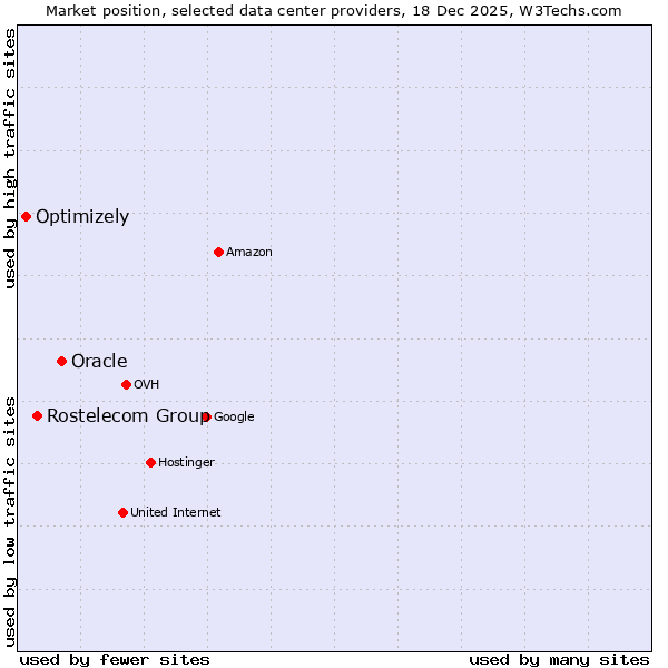 TechnologiesContent ManagementServer-side Languages Client-side Languages JavaScript Libraries CSS Frameworks Web Servers Web Panels Operating Systems Web Hosting Data Centers Reverse Proxies DNS Servers Email Servers SSL Certificate Authorities Content Delivery Traffic Analysis Tools Advertising Networks Tag Managers Social Widgets Site Elements Structured Data Markup Languages Character Encodings Image File Formats Top Level Domains Server Locations Content Languages | Technologies > Data Centers > Technology usage comparison Comparison of the usage statistics of Oracle vs. Rostelecom Group vs. Optimizely for websitesThis report shows the usage statistics of Oracle vs. Rostelecom Group vs. Optimizely as data center provider on the web. See technologies overview for explanations on the methodologies used in the surveys. Our reports are updated daily. UsageThis diagram shows the percentages of websites using the selected technologies. How to read the diagram: