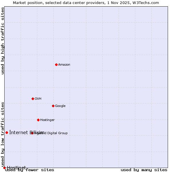 TechnologiesContent ManagementServer-side Languages Client-side Languages JavaScript Libraries CSS Frameworks Web Servers Web Panels Operating Systems Web Hosting Data Centers Reverse Proxies DNS Servers Email Servers SSL Certificate Authorities Content Delivery Traffic Analysis Tools Advertising Networks Tag Managers Social Widgets Site Elements Structured Data Markup Languages Character Encodings Image File Formats Top Level Domains Server Locations Content Languages ComparisonCompare with other | Technologies > Data Centers > Technology usage comparison Comparison of the usage statistics of İnternet Bilişim vs. Hostinet for websitesThis report shows the usage statistics of İnternet Bilişim vs. Hostinet as data center provider on the web. See technologies overview for explanations on the methodologies used in the surveys. Our reports are updated daily. UsageThis diagram shows the percentages of websites using the selected technologies. How to read the diagram:
