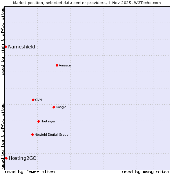 TechnologiesContent ManagementServer-side Languages Client-side Languages JavaScript Libraries CSS Frameworks Web Servers Web Panels Operating Systems Web Hosting Data Centers Reverse Proxies DNS Servers Email Servers SSL Certificate Authorities Content Delivery Traffic Analysis Tools Advertising Networks Tag Managers Social Widgets Site Elements Structured Data Markup Languages Character Encodings Image File Formats Top Level Domains Server Locations Content Languages ComparisonCompare with other | Technologies > Data Centers > Technology usage comparison Comparison of the usage statistics of Hosting2GO vs. Nameshield for websitesThis report shows the usage statistics of Hosting2GO vs. Nameshield as data center provider on the web. See technologies overview for explanations on the methodologies used in the surveys. Our reports are updated daily. UsageThis diagram shows the percentages of websites using the selected technologies. How to read the diagram: