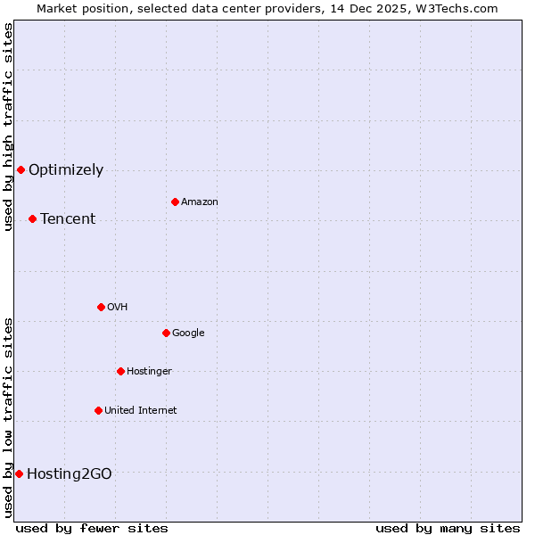 TechnologiesContent ManagementServer-side Languages Client-side Languages JavaScript Libraries CSS Frameworks Web Servers Web Panels Operating Systems Web Hosting Data Centers Reverse Proxies DNS Servers Email Servers SSL Certificate Authorities Content Delivery Traffic Analysis Tools Advertising Networks Tag Managers Social Widgets Site Elements Structured Data Markup Languages Character Encodings Image File Formats Top Level Domains Server Locations Content Languages | Technologies > Data Centers > Technology usage comparison Comparison of the usage statistics of Tencent vs. Optimizely vs. Hosting2GO for websitesThis report shows the usage statistics of Tencent vs. Optimizely vs. Hosting2GO as data center provider on the web. See technologies overview for explanations on the methodologies used in the surveys. Our reports are updated daily. UsageThis diagram shows the percentages of websites using the selected technologies. How to read the diagram: