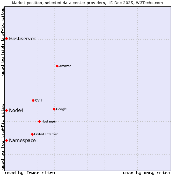 TechnologiesContent ManagementServer-side Languages Client-side Languages JavaScript Libraries CSS Frameworks Web Servers Web Panels Operating Systems Web Hosting Data Centers Reverse Proxies DNS Servers Email Servers SSL Certificate Authorities Content Delivery Traffic Analysis Tools Advertising Networks Tag Managers Social Widgets Site Elements Structured Data Markup Languages Character Encodings Image File Formats Top Level Domains Server Locations Content Languages | Technologies > Data Centers > Technology usage comparison Comparison of the usage statistics of Namespace vs. Hostiserver vs. Node4 for websitesThis report shows the usage statistics of Namespace vs. Hostiserver vs. Node4 as data center provider on the web. See technologies overview for explanations on the methodologies used in the surveys. Our reports are updated daily. UsageThis diagram shows the percentages of websites using the selected technologies. How to read the diagram: