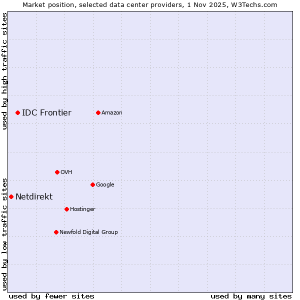 TechnologiesContent ManagementServer-side Languages Client-side Languages JavaScript Libraries CSS Frameworks Web Servers Web Panels Operating Systems Web Hosting Data Centers Reverse Proxies DNS Servers Email Servers SSL Certificate Authorities Content Delivery Traffic Analysis Tools Advertising Networks Tag Managers Social Widgets Site Elements Structured Data Markup Languages Character Encodings Image File Formats Top Level Domains Server Locations Content Languages ComparisonCompare with other | Technologies > Data Centers > Technology usage comparison Comparison of the usage statistics of IDC Frontier vs. Netdirekt for websitesThis report shows the usage statistics of IDC Frontier vs. Netdirekt as data center provider on the web. See technologies overview for explanations on the methodologies used in the surveys. Our reports are updated daily. UsageThis diagram shows the percentages of websites using the selected technologies. How to read the diagram: