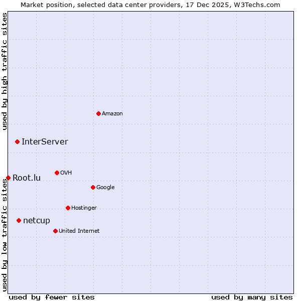 TechnologiesContent ManagementServer-side Languages Client-side Languages JavaScript Libraries CSS Frameworks Web Servers Web Panels Operating Systems Web Hosting Data Centers Reverse Proxies DNS Servers Email Servers SSL Certificate Authorities Content Delivery Traffic Analysis Tools Advertising Networks Tag Managers Social Widgets Site Elements Structured Data Markup Languages Character Encodings Image File Formats Top Level Domains Server Locations Content Languages | Technologies > Data Centers > Technology usage comparison Comparison of the usage statistics of netcup vs. InterServer vs. Root.lu for websitesThis report shows the usage statistics of netcup vs. InterServer vs. Root.lu as data center provider on the web. See technologies overview for explanations on the methodologies used in the surveys. Our reports are updated daily. UsageThis diagram shows the percentages of websites using the selected technologies. How to read the diagram: