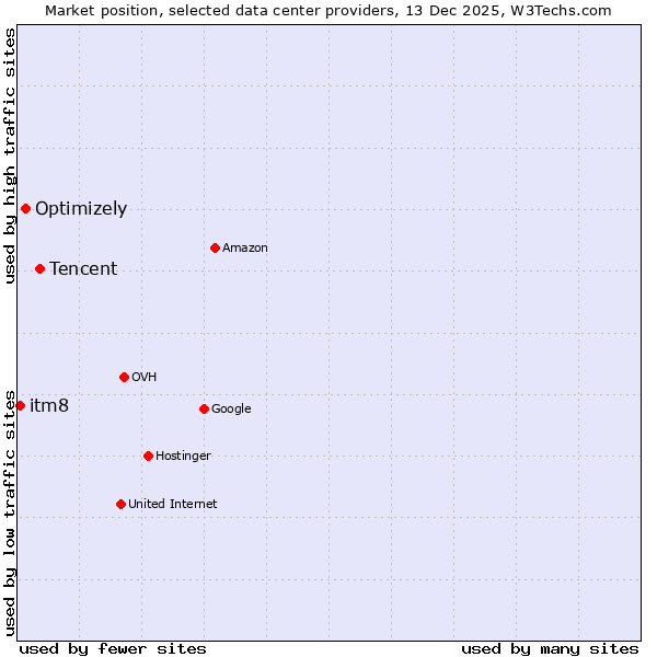 TechnologiesContent ManagementServer-side Languages Client-side Languages JavaScript Libraries CSS Frameworks Web Servers Web Panels Operating Systems Web Hosting Data Centers Reverse Proxies DNS Servers Email Servers SSL Certificate Authorities Content Delivery Traffic Analysis Tools Advertising Networks Tag Managers Social Widgets Site Elements Structured Data Markup Languages Character Encodings Image File Formats Top Level Domains Server Locations Content Languages | Technologies > Data Centers > Technology usage comparison Comparison of the usage statistics of Tencent vs. Optimizely vs. itm8 for websitesThis report shows the usage statistics of Tencent vs. Optimizely vs. itm8 as data center provider on the web. See technologies overview for explanations on the methodologies used in the surveys. Our reports are updated daily. UsageThis diagram shows the percentages of websites using the selected technologies. How to read the diagram:
