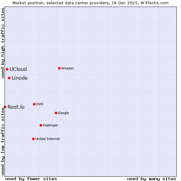 TechnologiesContent ManagementServer-side Languages Client-side Languages JavaScript Libraries CSS Frameworks Web Servers Web Panels Operating Systems Web Hosting Data Centers Reverse Proxies DNS Servers Email Servers SSL Certificate Authorities Content Delivery Traffic Analysis Tools Advertising Networks Tag Managers Social Widgets Site Elements Structured Data Markup Languages Character Encodings Image File Formats Top Level Domains Server Locations Content Languages | Technologies > Data Centers > Technology usage comparison Comparison of the usage statistics of Linode vs. UCloud vs. Root.lu for websitesThis report shows the usage statistics of Linode vs. UCloud vs. Root.lu as data center provider on the web. See technologies overview for explanations on the methodologies used in the surveys. Our reports are updated daily. UsageThis diagram shows the percentages of websites using the selected technologies. How to read the diagram: