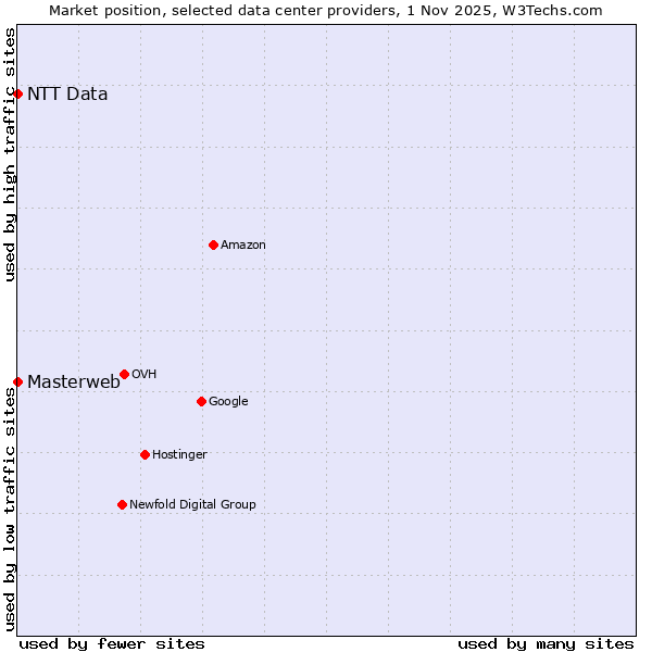 TechnologiesContent ManagementServer-side Languages Client-side Languages JavaScript Libraries CSS Frameworks Web Servers Web Panels Operating Systems Web Hosting Data Centers Reverse Proxies DNS Servers Email Servers SSL Certificate Authorities Content Delivery Traffic Analysis Tools Advertising Networks Tag Managers Social Widgets Site Elements Structured Data Markup Languages Character Encodings Image File Formats Top Level Domains Server Locations Content Languages ComparisonCompare with other | Technologies > Data Centers > Technology usage comparison Comparison of the usage statistics of NTT Data vs. Masterweb for websitesThis report shows the usage statistics of NTT Data vs. Masterweb as data center provider on the web. See technologies overview for explanations on the methodologies used in the surveys. Our reports are updated daily. UsageThis diagram shows the percentages of websites using the selected technologies. How to read the diagram: