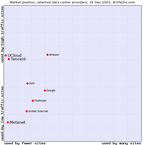 TechnologiesContent ManagementServer-side Languages Client-side Languages JavaScript Libraries CSS Frameworks Web Servers Web Panels Operating Systems Web Hosting Data Centers Reverse Proxies DNS Servers Email Servers SSL Certificate Authorities Content Delivery Traffic Analysis Tools Advertising Networks Tag Managers Social Widgets Site Elements Structured Data Markup Languages Character Encodings Image File Formats Top Level Domains Server Locations Content Languages | Technologies > Data Centers > Technology usage comparison Comparison of the usage statistics of Tencent vs. Metanet vs. UCloud for websitesThis report shows the usage statistics of Tencent vs. Metanet vs. UCloud as data center provider on the web. See technologies overview for explanations on the methodologies used in the surveys. Our reports are updated daily. UsageThis diagram shows the percentages of websites using the selected technologies. How to read the diagram: