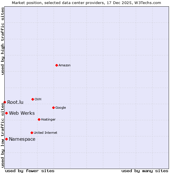TechnologiesContent ManagementServer-side Languages Client-side Languages JavaScript Libraries CSS Frameworks Web Servers Web Panels Operating Systems Web Hosting Data Centers Reverse Proxies DNS Servers Email Servers SSL Certificate Authorities Content Delivery Traffic Analysis Tools Advertising Networks Tag Managers Social Widgets Site Elements Structured Data Markup Languages Character Encodings Image File Formats Top Level Domains Server Locations Content Languages | Technologies > Data Centers > Technology usage comparison Comparison of the usage statistics of Namespace vs. Web Werks vs. Root.lu for websitesThis report shows the usage statistics of Namespace vs. Web Werks vs. Root.lu as data center provider on the web. See technologies overview for explanations on the methodologies used in the surveys. Our reports are updated daily. UsageThis diagram shows the percentages of websites using the selected technologies. How to read the diagram: