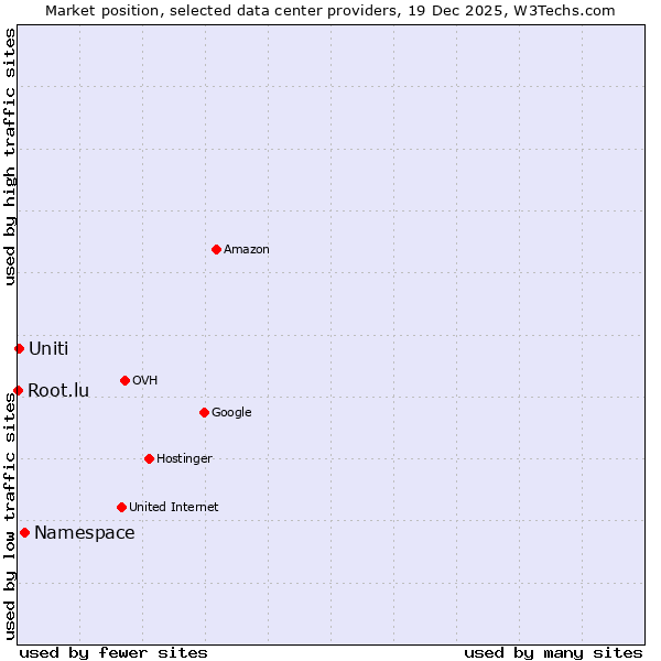 TechnologiesContent ManagementServer-side Languages Client-side Languages JavaScript Libraries CSS Frameworks Web Servers Web Panels Operating Systems Web Hosting Data Centers Reverse Proxies DNS Servers Email Servers SSL Certificate Authorities Content Delivery Traffic Analysis Tools Advertising Networks Tag Managers Social Widgets Site Elements Structured Data Markup Languages Character Encodings Image File Formats Top Level Domains Server Locations Content Languages | Technologies > Data Centers > Technology usage comparison Comparison of the usage statistics of Namespace vs. Uniti vs. Root.lu for websitesThis report shows the usage statistics of Namespace vs. Uniti vs. Root.lu as data center provider on the web. See technologies overview for explanations on the methodologies used in the surveys. Our reports are updated daily. UsageThis diagram shows the percentages of websites using the selected technologies. How to read the diagram: