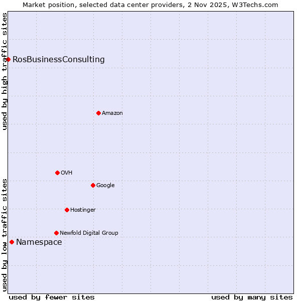 TechnologiesContent ManagementServer-side Languages Client-side Languages JavaScript Libraries CSS Frameworks Web Servers Web Panels Operating Systems Web Hosting Data Centers Reverse Proxies DNS Servers Email Servers SSL Certificate Authorities Content Delivery Traffic Analysis Tools Advertising Networks Tag Managers Social Widgets Site Elements Structured Data Markup Languages Character Encodings Image File Formats Top Level Domains Server Locations Content Languages ComparisonCompare with other | Technologies > Data Centers > Technology usage comparison Comparison of the usage statistics of Namespace vs. RosBusinessConsulting for websitesThis report shows the usage statistics of Namespace vs. RosBusinessConsulting as data center provider on the web. See technologies overview for explanations on the methodologies used in the surveys. Our reports are updated daily. UsageThis diagram shows the percentages of websites using the selected technologies. How to read the diagram: