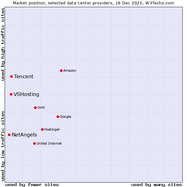 TechnologiesContent ManagementServer-side Languages Client-side Languages JavaScript Libraries CSS Frameworks Web Servers Web Panels Operating Systems Web Hosting Data Centers Reverse Proxies DNS Servers Email Servers SSL Certificate Authorities Content Delivery Traffic Analysis Tools Advertising Networks Tag Managers Social Widgets Site Elements Structured Data Markup Languages Character Encodings Image File Formats Top Level Domains Server Locations Content Languages | Technologies > Data Centers > Technology usage comparison Comparison of the usage statistics of Tencent vs. VSHosting vs. NetAngels for websitesThis report shows the usage statistics of Tencent vs. VSHosting vs. NetAngels as data center provider on the web. See technologies overview for explanations on the methodologies used in the surveys. Our reports are updated daily. UsageThis diagram shows the percentages of websites using the selected technologies. How to read the diagram: